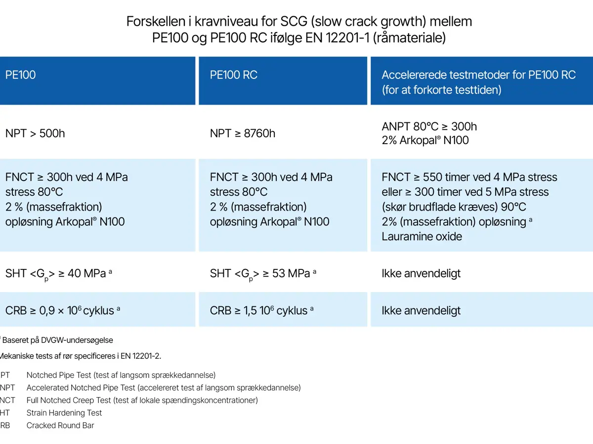 Tabellen nedenfor illustrerer forskellen i kravs niveauet mellem PE100 og PE100 RC. Som det fremgår, er der højere krav til både råvare og færdigt rør af PE100 RC iht. standarden EN 12201. Det er vigtigt at bemærke, at testene afbrydes efter en anført tidsramme i kravs niveauet og svarer således kun til det laveste niveau.