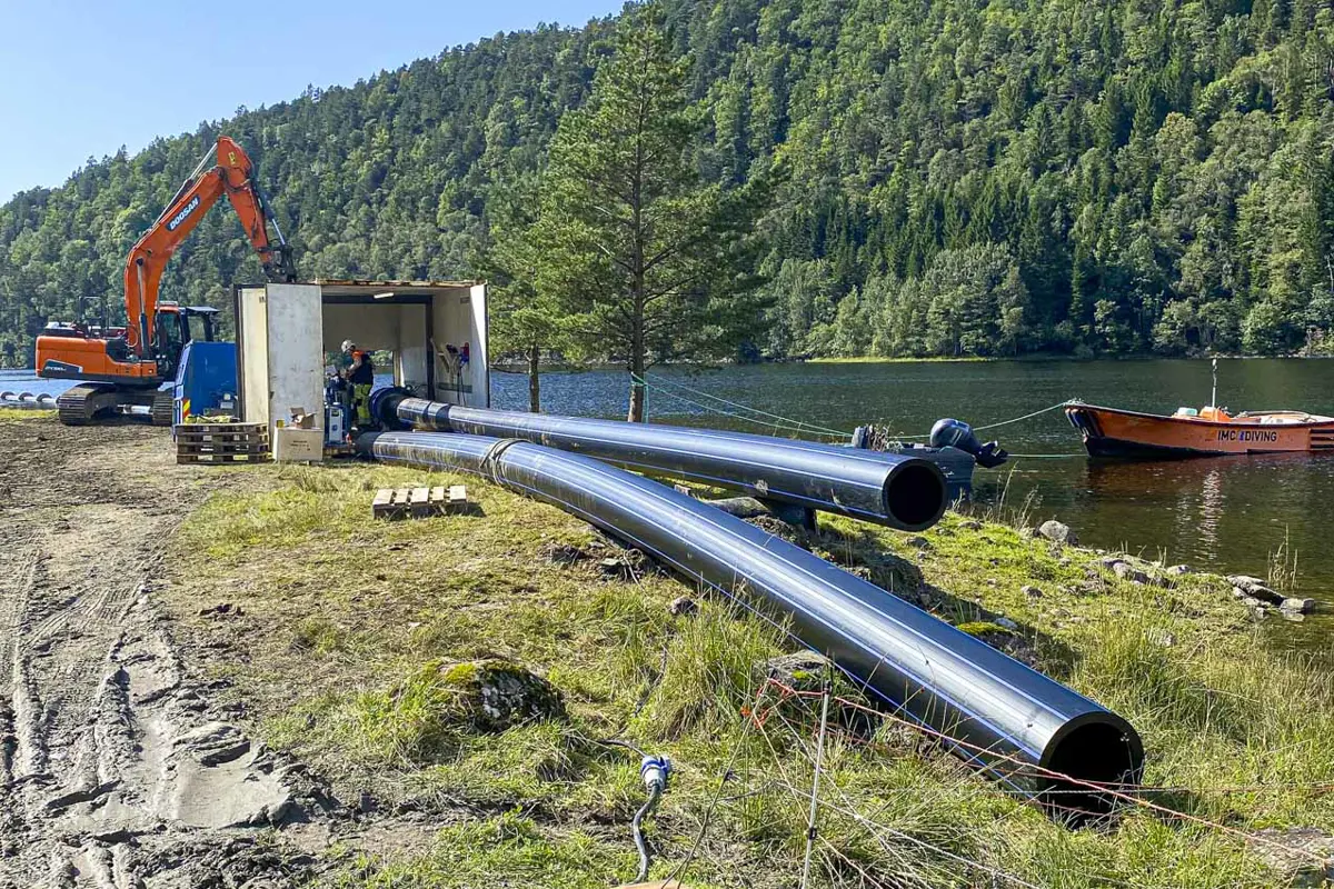 En viktig råvannsledning røk på bunnen av Gåssandvatnet og satte vannforsyningen i Bjørnafjorden kommune i fare. Hordaland Rørteknikk og samarbeidspartnere tok hasteoppdraget med å sveise, trekke og senke en ny 2,7 kilometer undervannsledning. Det ble gjort på rekordtid.